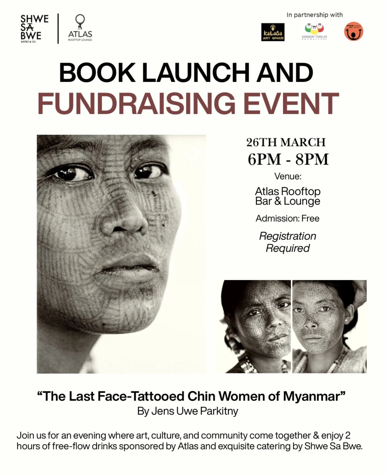 On March 26, on the occasion of my new book “ The Last Face-Tattooed Chin Women of Myanmar”, a limited edition b/w art photo book with a hand made hardcover (covered with Shan cotton) and 128 pages, featuring 44 b/w portraits of Chin women with traditional facial tattoos from Western Myanmar, I organised a book sales and fundraise event in Yangon, sponsored by Swe Sa Bwe Bistro and Atlas Rooftop Bar, and in partnership with Kalasa Art Space and Nawaday Thalar Gallery. The funds raised support a new day care center for street kids in Yangon’s South Dagon slum, Ward 60, initiated and operated by Sonne Social Organisation (SSO). Sonne Social Organisation is a local grass roots organisation taking care of underprivileged communities, in particular children, in Yangon and surroundings since 2008. The event was attended by over 160 guests and with their help USD 4,000 in funds were raised to support SSO’s new day care center, where they provide informal education, medical care and healthy meal to children that live on and off the streets.